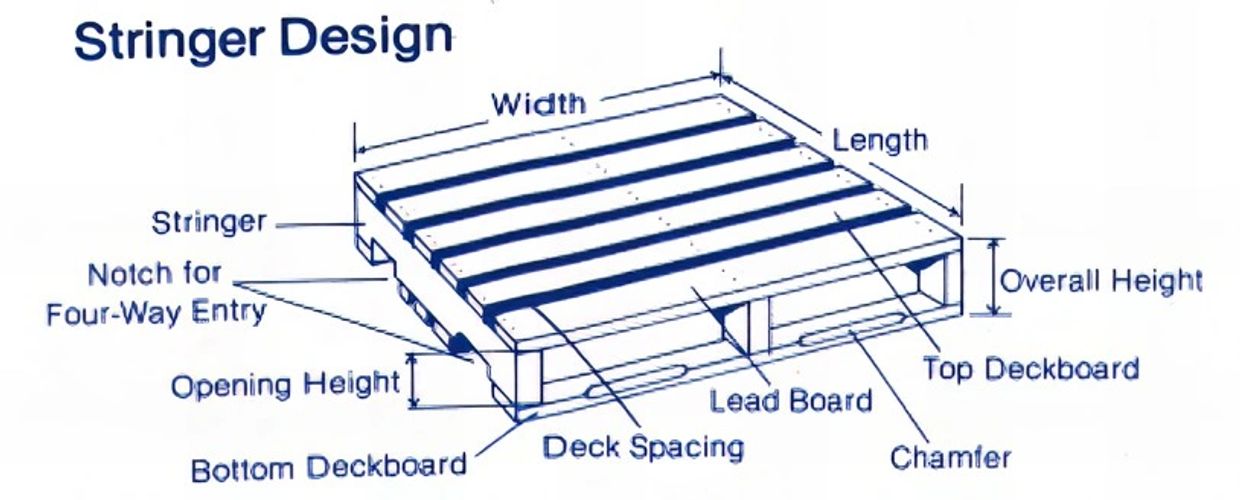 STRINGER PALLET- A Stringer is a continuous, longitudinal, solid or notched beam-component of the pallet used to support and space the deck components, often identified by location as the outside, interior, or center stringer; bearer; runner.